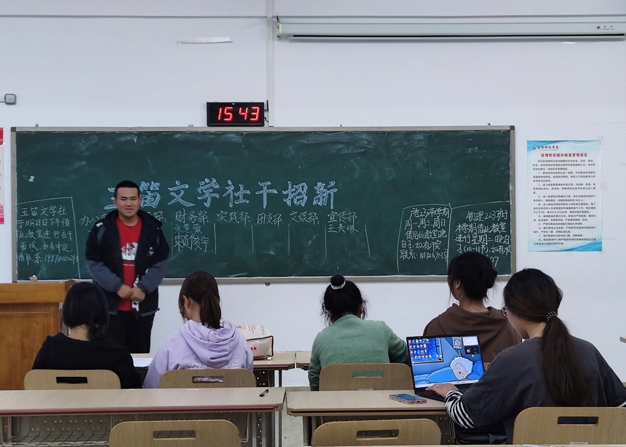 本站讯 10月21日下午,玉笛文学社于公司东校区至善楼301教室开展2023-2024届社干招新活动。本次招新采取线上和线下报名两种方式,全体社干参加此次线下招新活动。