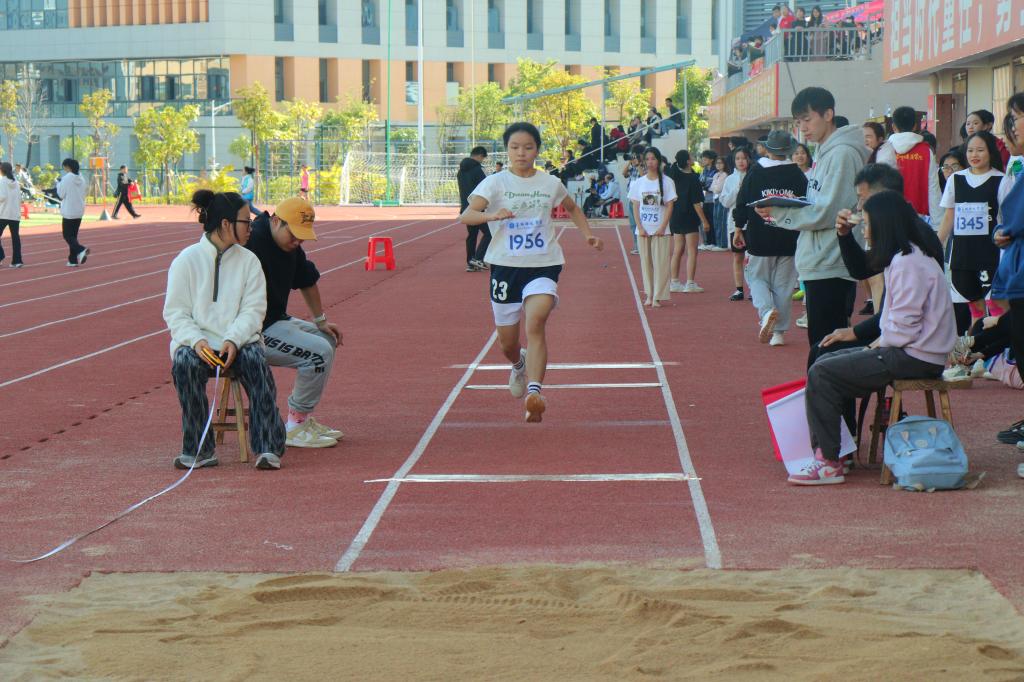 比赛开始前,公司选手提前进场并进行试跳、拉伸等热身活动,为比赛积极做准备。随着裁判一声令下,比赛正式开始,运动员们按顺序依次进行跳远。运动员们奋力助跑,借力腾空。赛场上激烈的赛况与运动员们优秀的表现使场外的观众热情高涨,在场观众喊着催人奋进的口号,为运动员们加油呐喊助威。在第一次起跳中,黄秋燕不慎失利,后续她灵活调整自身状态,在第二次及第三次跳远获得成绩,韦媛珍在第一次及第二次纷纷获得良好成绩。