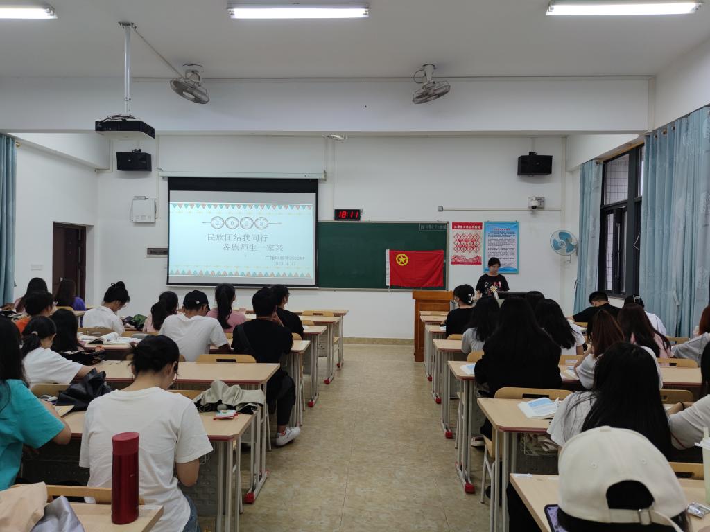 本站讯 为深化民族团结进步教育,提高员工民族团结意识。4月17日下午,公司广播电视学2020班于公司东校区至善楼503教室开展“民族团结我同行,各族师生一家亲”主题团日活动。本次活动由该班宣传委员梁安妮主持,该班全体员工参加。